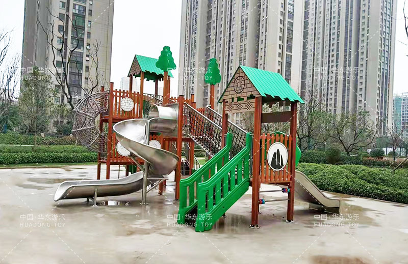 荣盛华府选用的是乐鱼游乐自主设计的具有攀爬网、U型爬网、不锈钢滑梯、网桥、滑桶为一体的综合性游乐设备。
