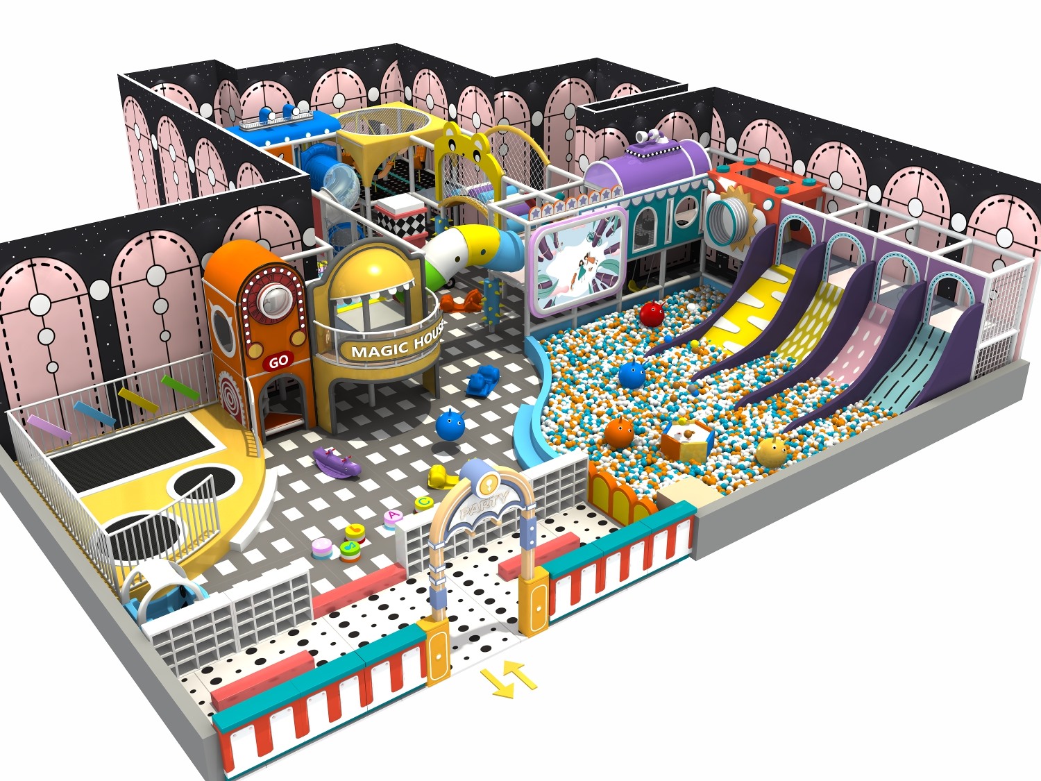 • 室内淘气堡又称室内儿童乐园,是针对儿童生理能力与心理特点喜欢钻、爬、滑、滚、晃、荡、跳、摇等玩耍动作而设计的综合性室内休闲娱乐场所。乐鱼游乐淘气堡项目具有多样性、互动性和安全性的特点,儿童在玩乐的同时能培养独立的个性,团队协作能力,沟通能力、克服困难、积极进取的精神,锻炼身体、健脑益智。