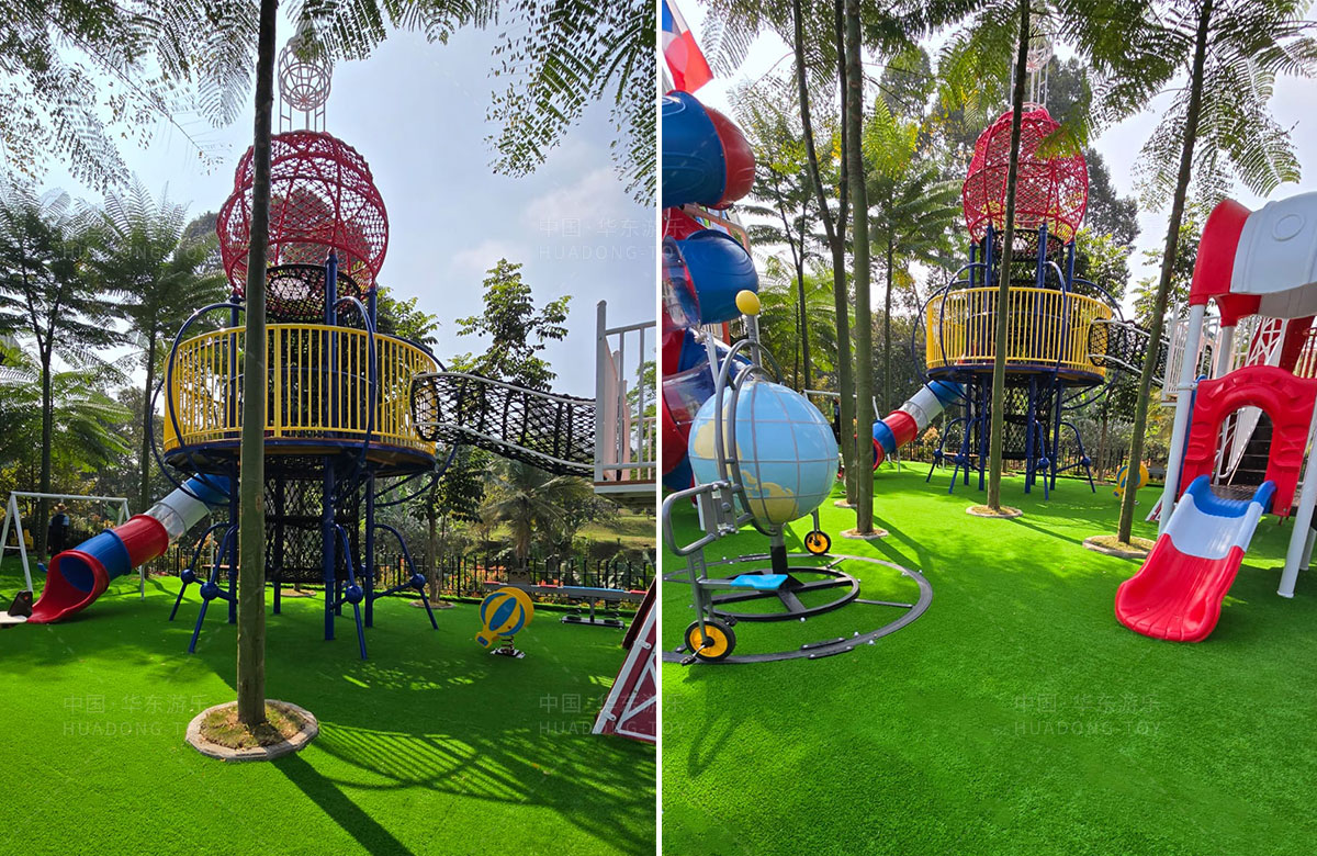 该项目选用的是乐鱼游乐自主研发和设计的跨国系列组合滑梯,该滑梯具备了攀爬网、钻洞、滑梯等功能,同时为了让整个游乐场变得更加具有生机与活力,整个项目还设置了小朋友喜欢的儿童摇摇乐、儿童跷跷板、以及地球旋转自行车等游乐设备,为当地的人群体提供了一个休闲娱乐的场所。